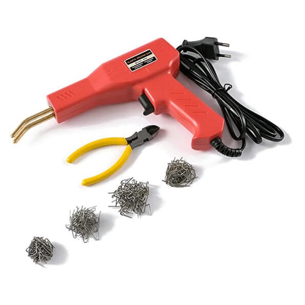 Zestaw zawiera urządzenie do spawania, szczypce, nóż oraz 200 zszywek w różnych rozmiarach przechowywanych w wygodnej walizce. Te zszywki są bardzo odporne na ciepło i wodę, gwarantując długotrwałe naprawy.